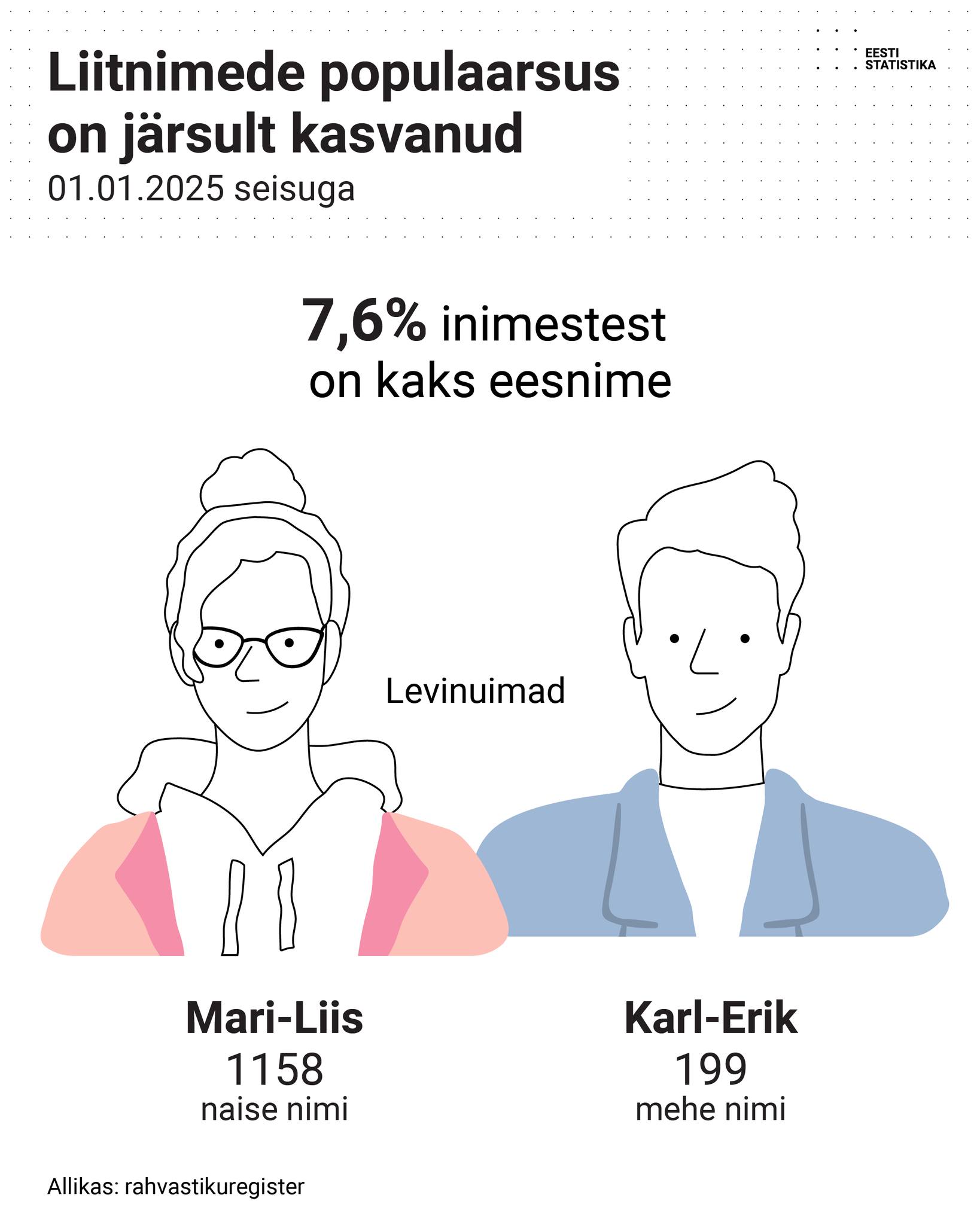 Liitnimede populaarsus on järsult kasvanud alates taasiseseisvumisest. Viimase paarikümne aasta jooksul on ligi kuuendik poistest ja ligi viiendik tüdrukutest saanud endale rohkem kui ühe nime. Erinevaid kahe eesnime kombinatsioone on ligi 83 000 ja pea 90% nendest on ainulaadsed. Kõige populaarsem liitnimi naiste seas on Mari-Liis ja meeste seas Karl-Erik. Loe lähemalt!