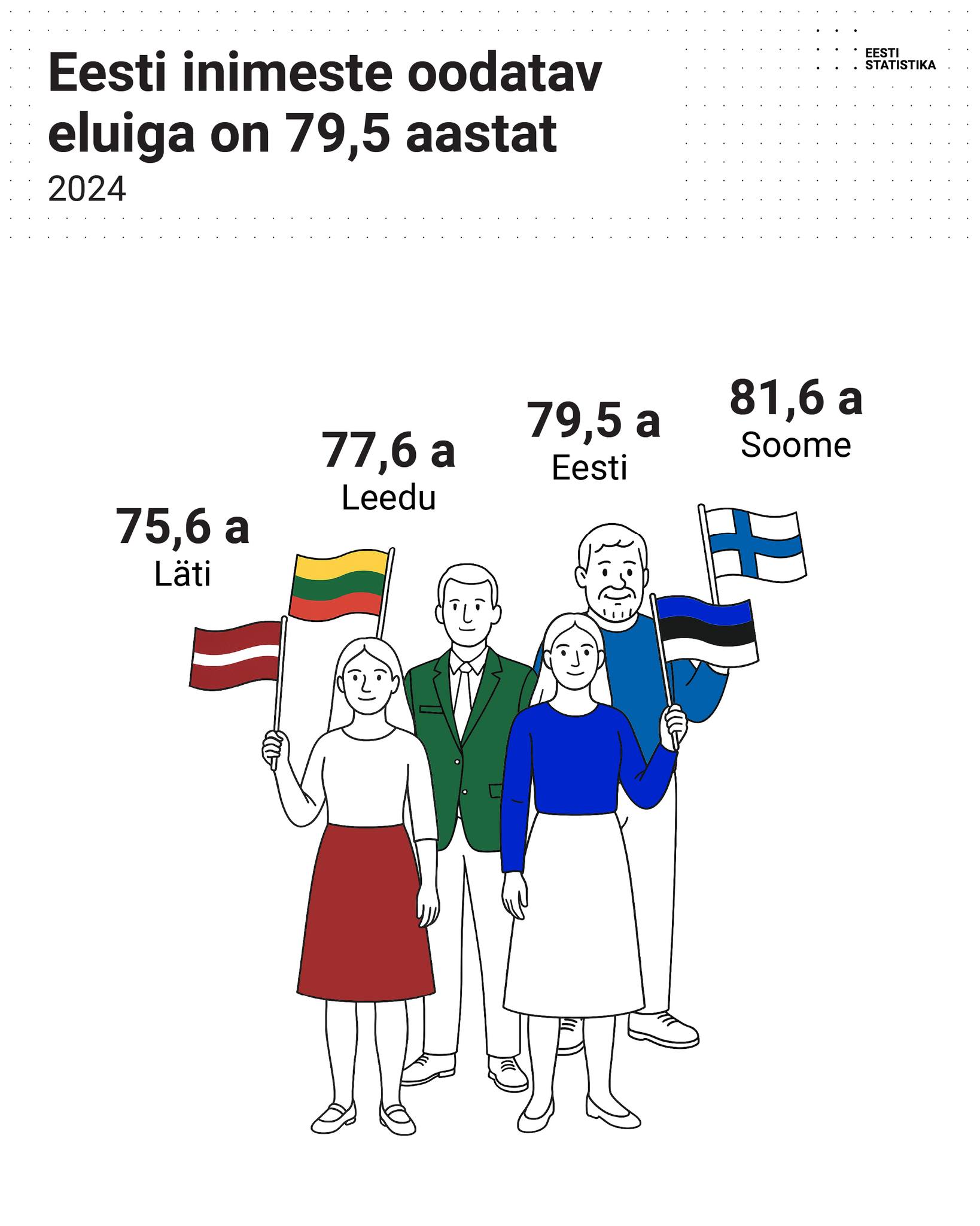 2024. aastal oli eestimaalaste oodatav eluiga sünnimomendil 79,5 aastat. Selle näitajaga tegi Eesti Euroopa riikidest viimase kolme aastakümne kõige suurema tõusu. Eestimaalaste tervena elada jäänud aastad sünnimomendil on 58,7. Loe lähemalt!