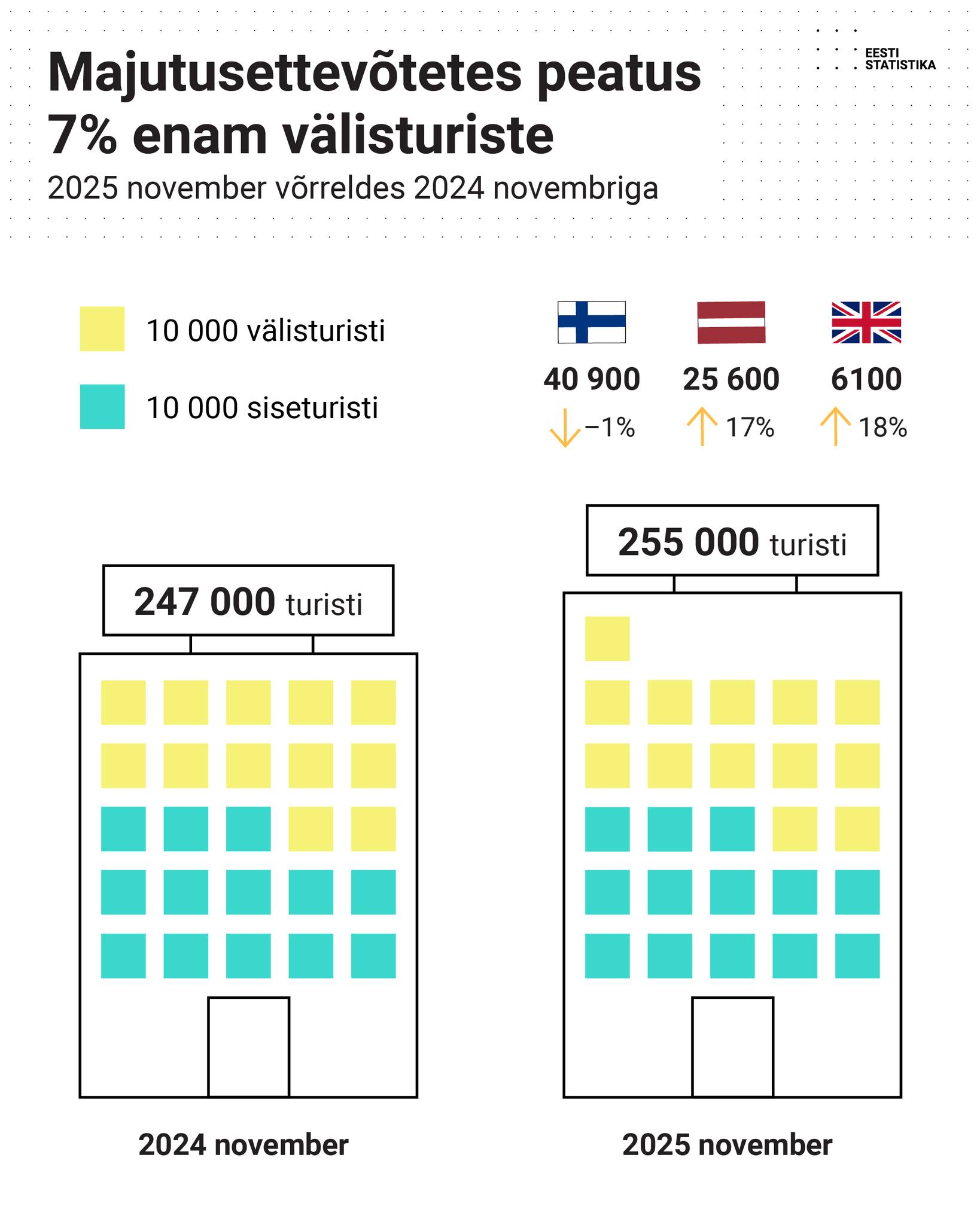 Novembris peatus majutusettevõtetes 254 989 turisti, mida on 3% enam kui aasta varem samas kuus. Välisturiste oli 7% enam, siseturistide arv ei kasvanud. Enim saabus välisturiste Soomest, Lätist, Suurbritanniast, Saksamaalt ja Leedust. Majutusettevõtetes peatunud Soome turiste oli 1% vähem ja Läti turiste 17% rohkem kui aasta varem