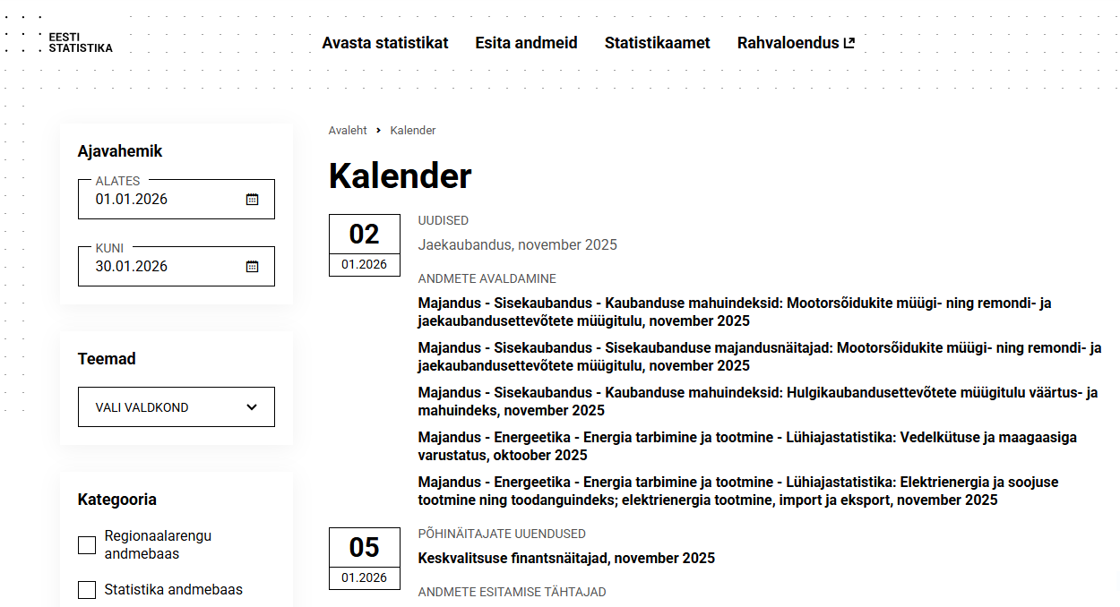 Kalendrist tuleb avaldamiste vaatamiseks valida soovitud periood. Ülevaadet on võimalik kitsendada nii valdkonna kui ka avaldamise liigi järgi: andmete avaldamine, põhinäitajate uuendused, uudised jne. Regulaarsed pressiteated leiab kalendrist uudiste kategooria alt.