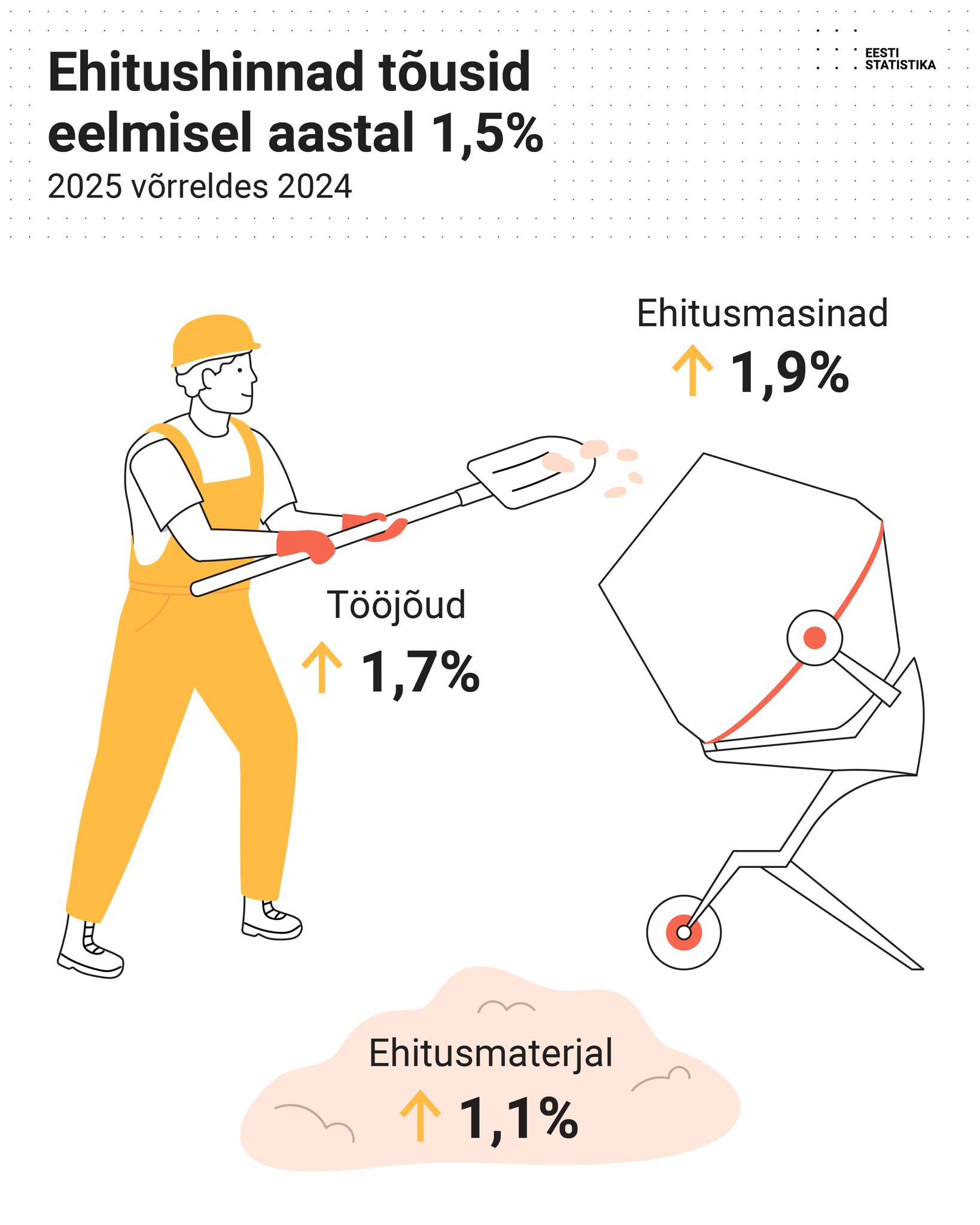 Ehitushinnaindeksi tõusu panustas 2025. aastal võrreldes 2024. aasta keskmisega mõjult enim materjalide hinnatõus. Kui ehitushinnaindeks tõusis 2025. aastal 1,5%, siis sealhulgas kallines tööjõud 1,7%, masinate kasutamine 1,9% ja materjalide hinnad tõusid 1,1%.