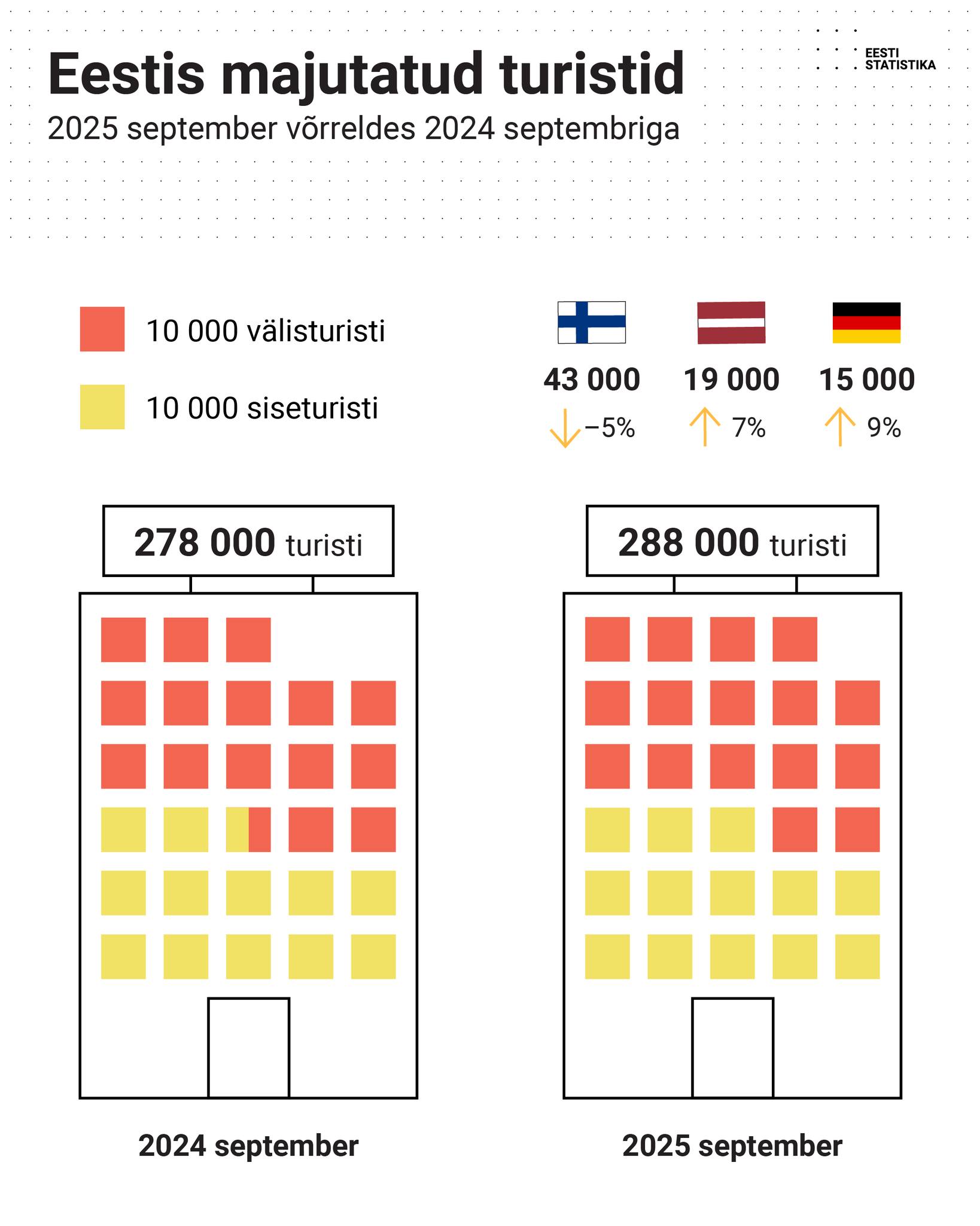 Soomest saabus septembris Eestisse 43 000 turisti ning nad moodustasid 27% kõigist majutuskohtades peatunud välisturistidest. Ehkki Soome turiste oli kõige rohkem, vähenes nende arv aasta võrdluses viiendat kuud järjest.