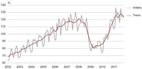 Töötleva tööstuse toodangu mahuindeks ja selle trenda, jaanuar 2002 – november 2011 (2005 = 100)