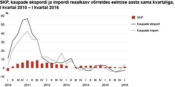 Kogumajanduse kaupade väljavedu vähenes võrreldes 2015. aasta I kvartaliga hinnamõjusid arvesse võttes 2%, peamiselt elektroonikakaupade ja mineraalsete toodete (sh bensiin, diisel, kütteõlid, gaas) väljaveo vähenemise tõttu. Samal ajal suurenes kogumajanduse kaupade sissevedu, olles reaalväärtuses 4% suurem kui eelmise aasta samas kvartalis. Esialgsetel andmetel suurenes enim mujal klassifitseerimata masinate ja seadmete, mootorsõidukite ja haagiste ning mineraalsete toodete import.Majanduskasvu esialgne hinnang arvutatakse ainult tootmise meetodil. Arvutuste aluseks on Maksu- ja Tolliameti käibedeklaratsioonide info ja hinnangu koostamise hetkeks laekunud Statistikaameti erinevate statistikatööde andmed. Seetõttu võib esialgne hinnang erineda SKP täpsustatud näitajast, mis koostatakse vastava kvartali andmete põhjal tarbimise, tootmise ja sissetulekute meetodil.
