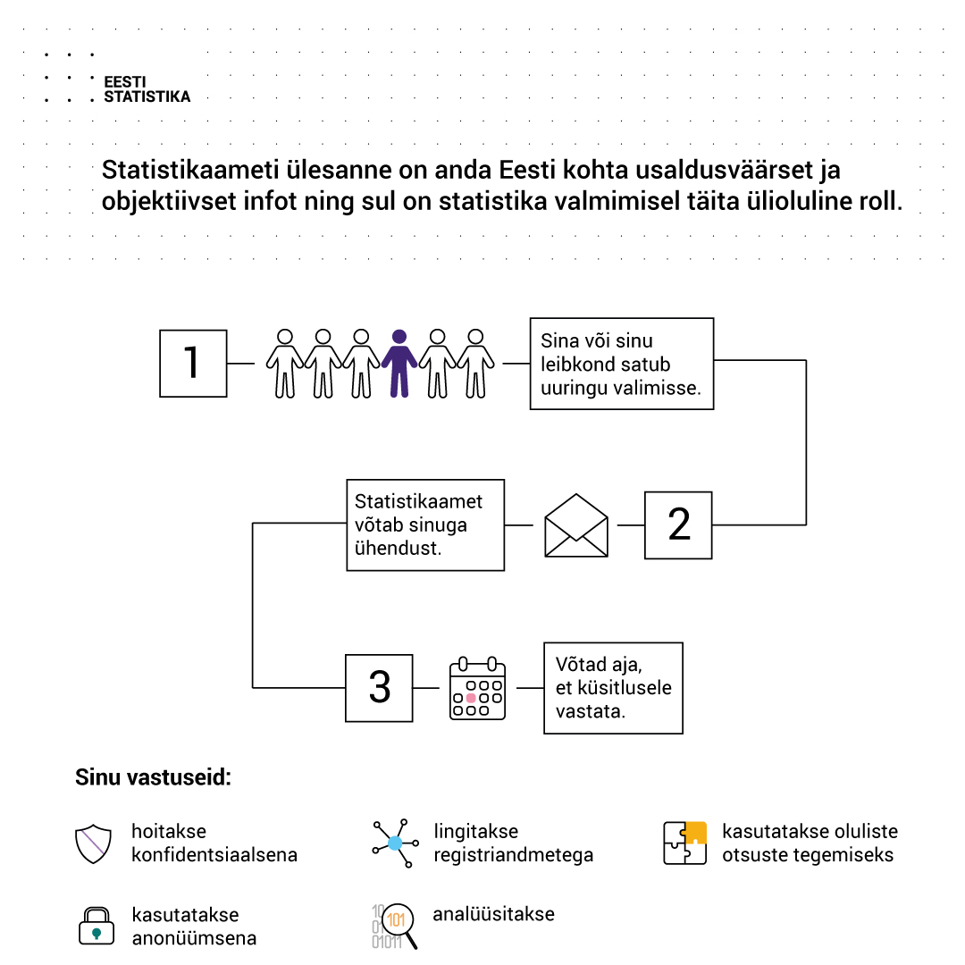 - Statistikaamet saadab uuringukutsed kirja või e-posti teel. Kui tekib kahtlus, saab kutse ehtsust kontrollida helistades statistikaameti klienditoele telefonil +372 625 9300 või kirjutades stat [at] stat.ee (stat[at]stat[dot]ee).